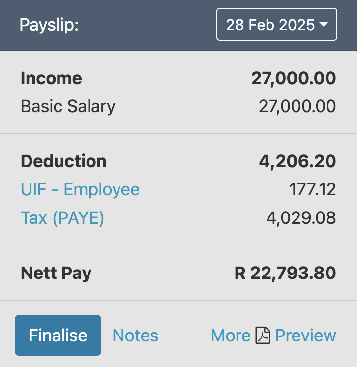 SimplePay automatically calculates statutory deductions for PAYE and UIF, and you will see these in the Payslip block, along with all of the other items you added above. When viewing the information in the Payslip block, you have the following options: