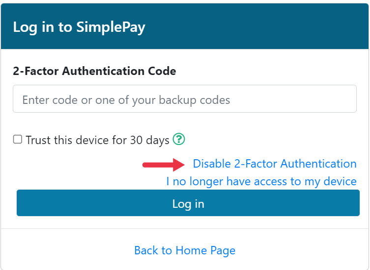 - Under 2-Factor Authentication, click on Enable 2-Factor Authentication, and enter your SimplePay password.
